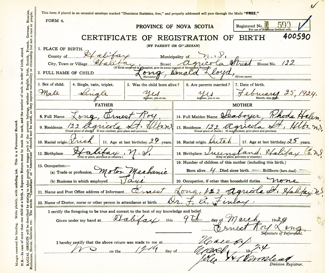 Male Birth Registration: Year: 1924 number: 40000590