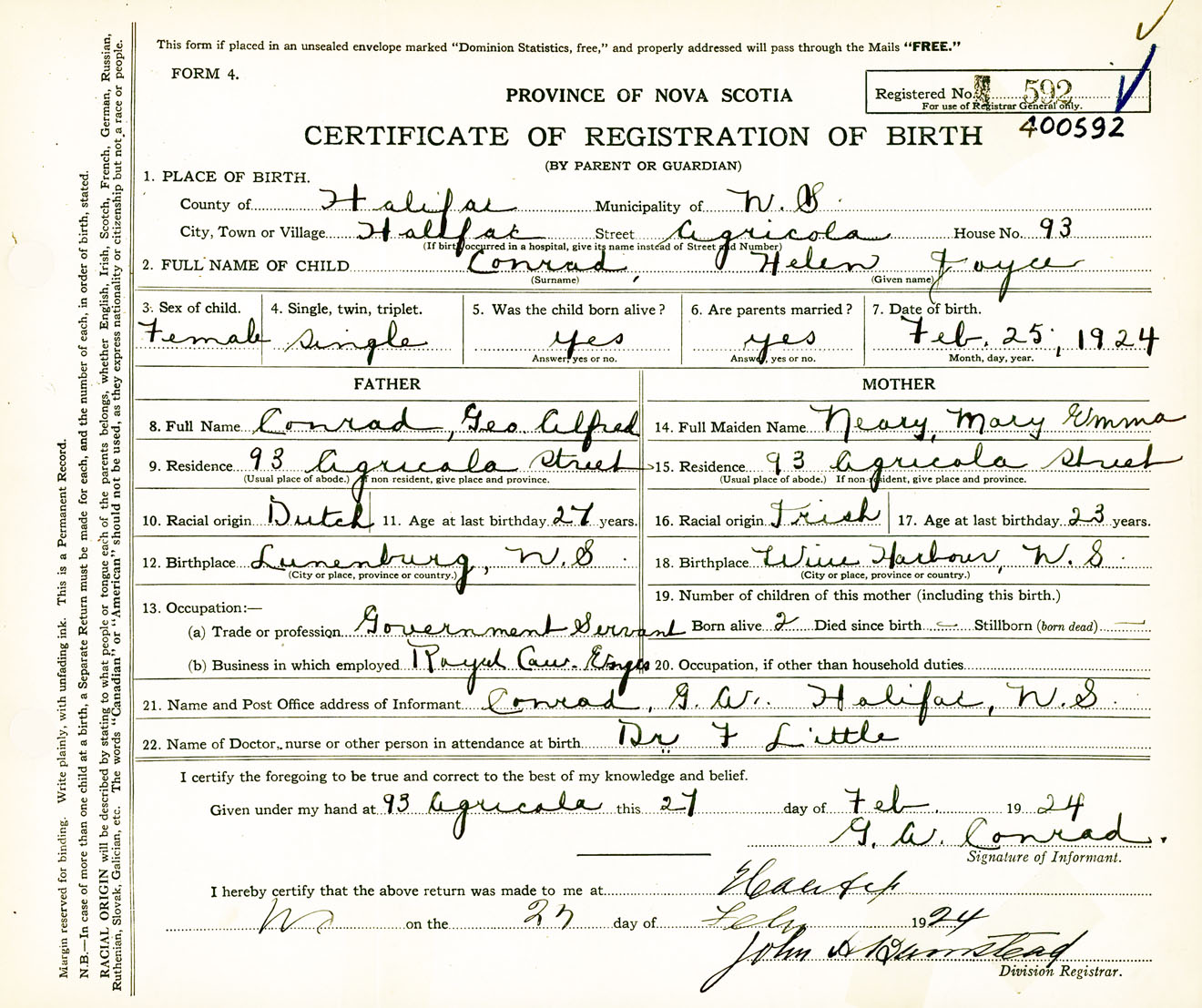 Female Birth Registration: Year: 1924 number: 40000592