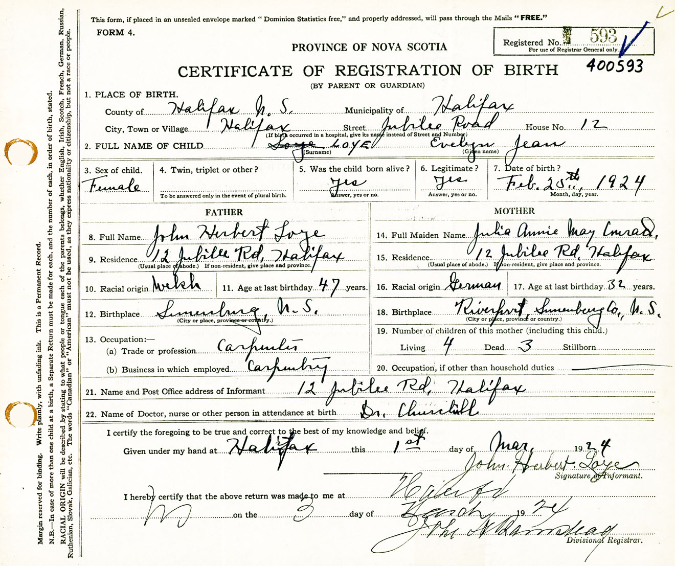 Female Birth Registration: Year: 1924 number: 40000593