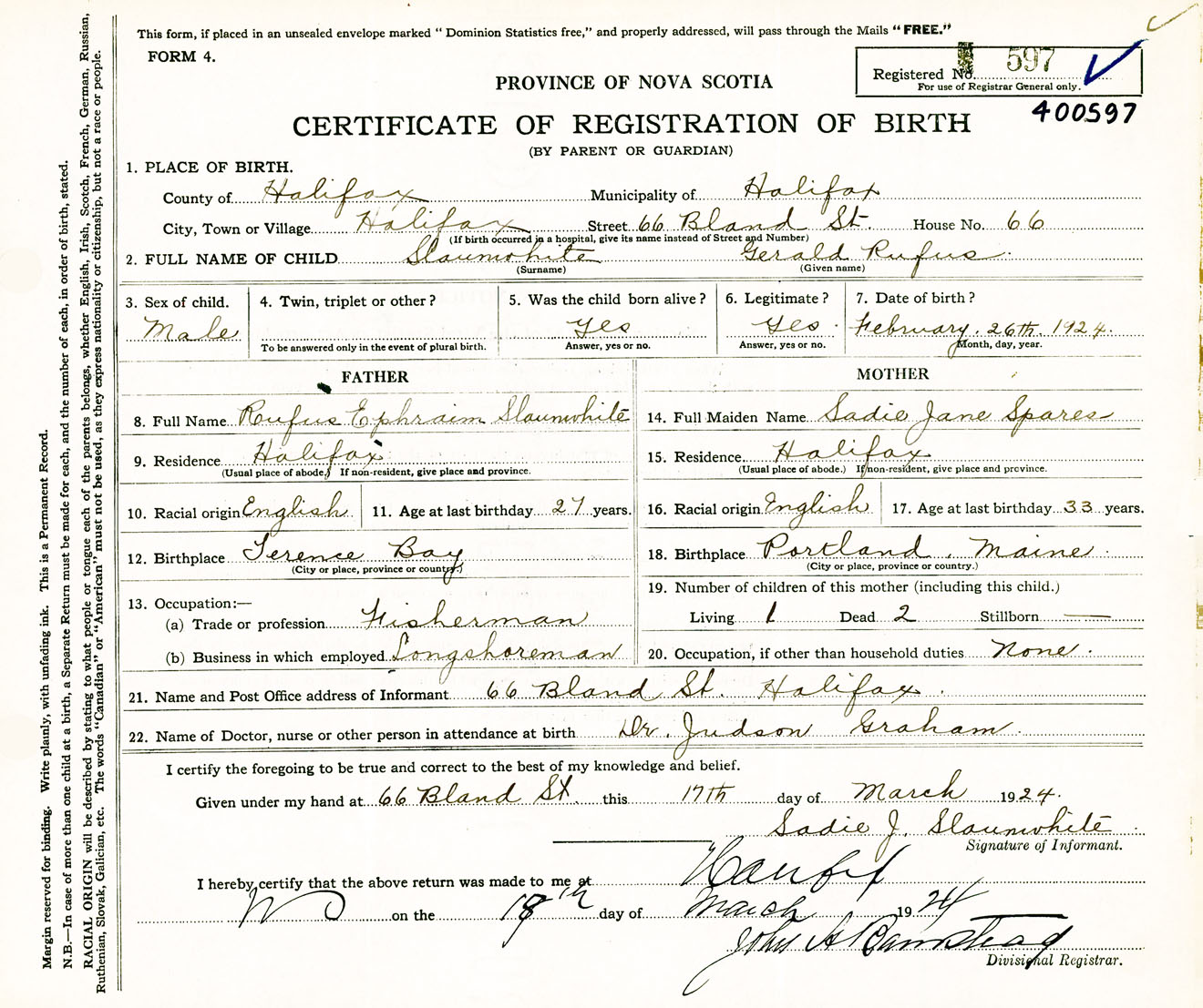 Male Birth Registration: Year: 1924 number: 40000597