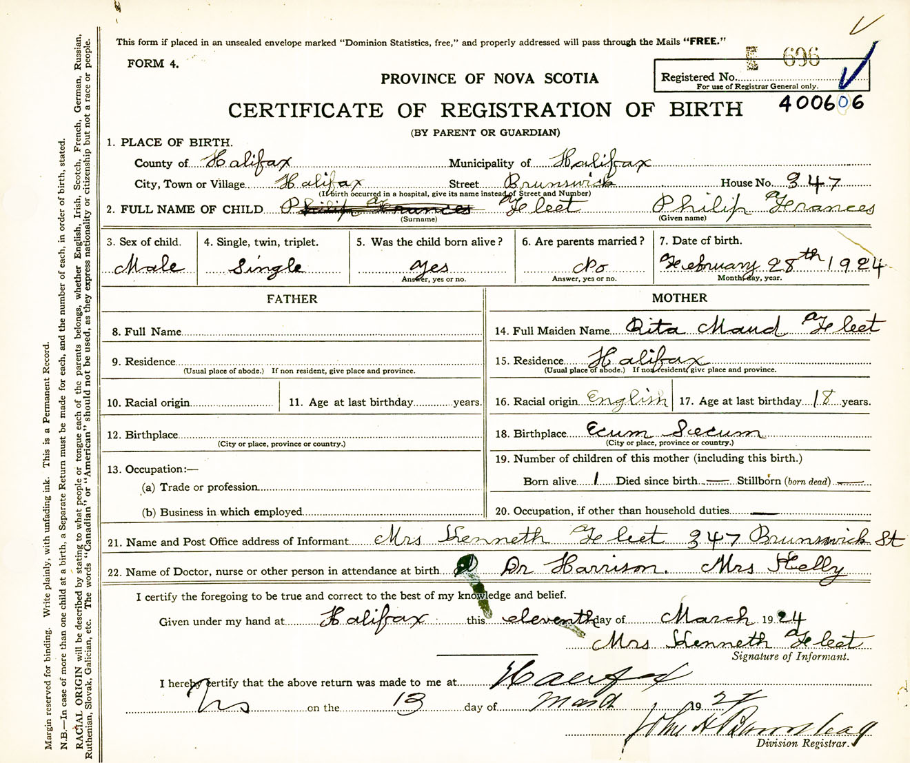 Male Birth Registration: Year: 1924 number: 40000606