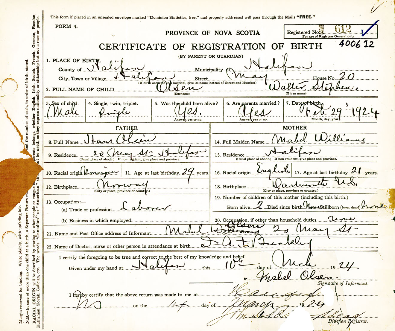 Male Birth Registration: Year: 1924 number: 40000612