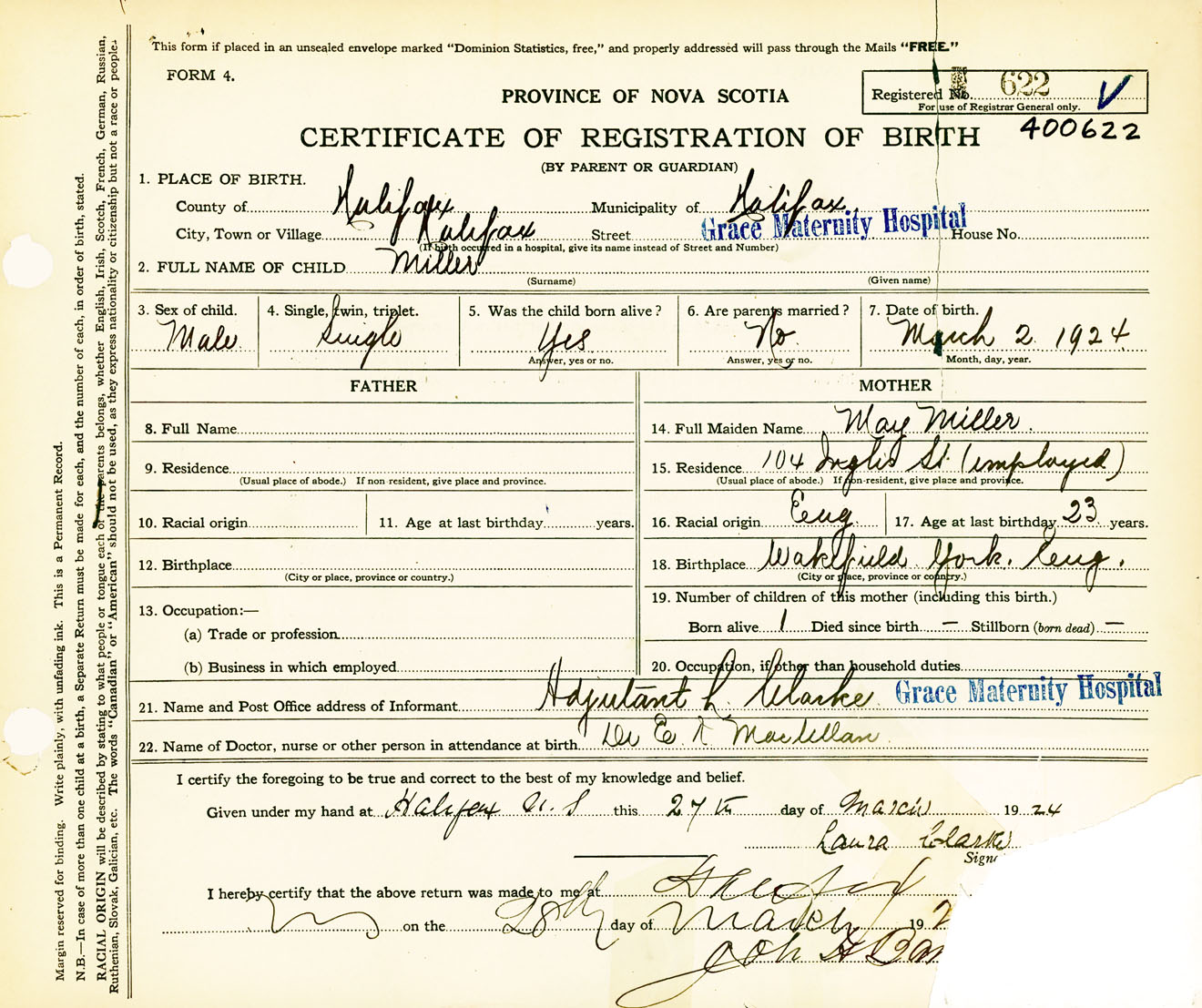 Male Birth Registration: Year: 1924 number: 40000622