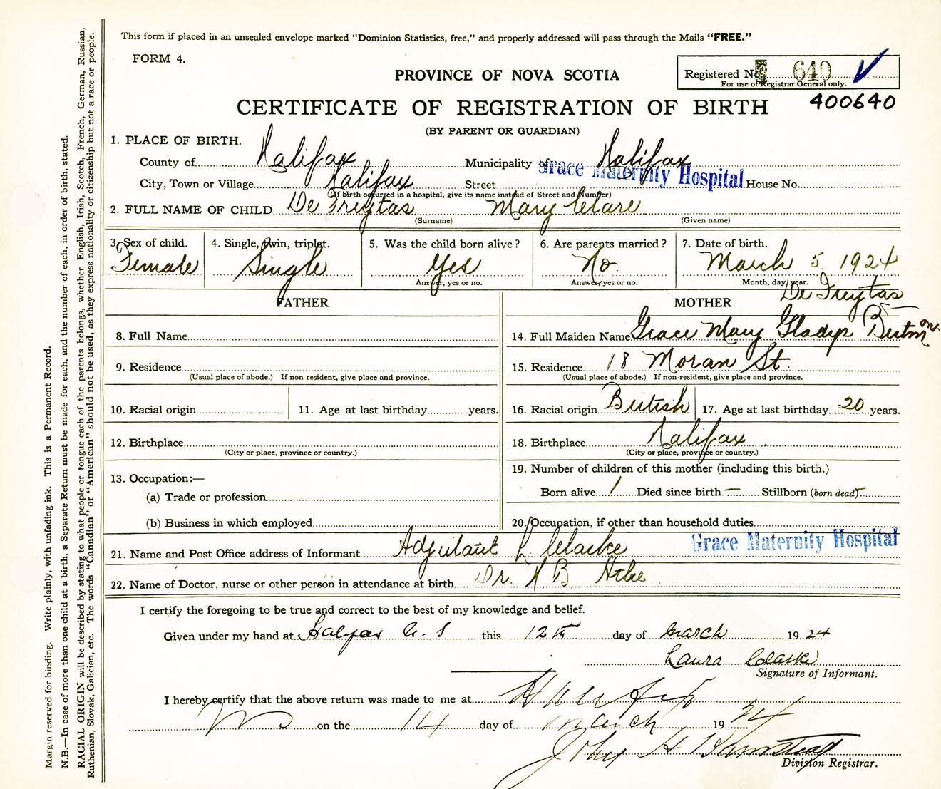 Female Birth Registration: Year: 1924 number: 40000640