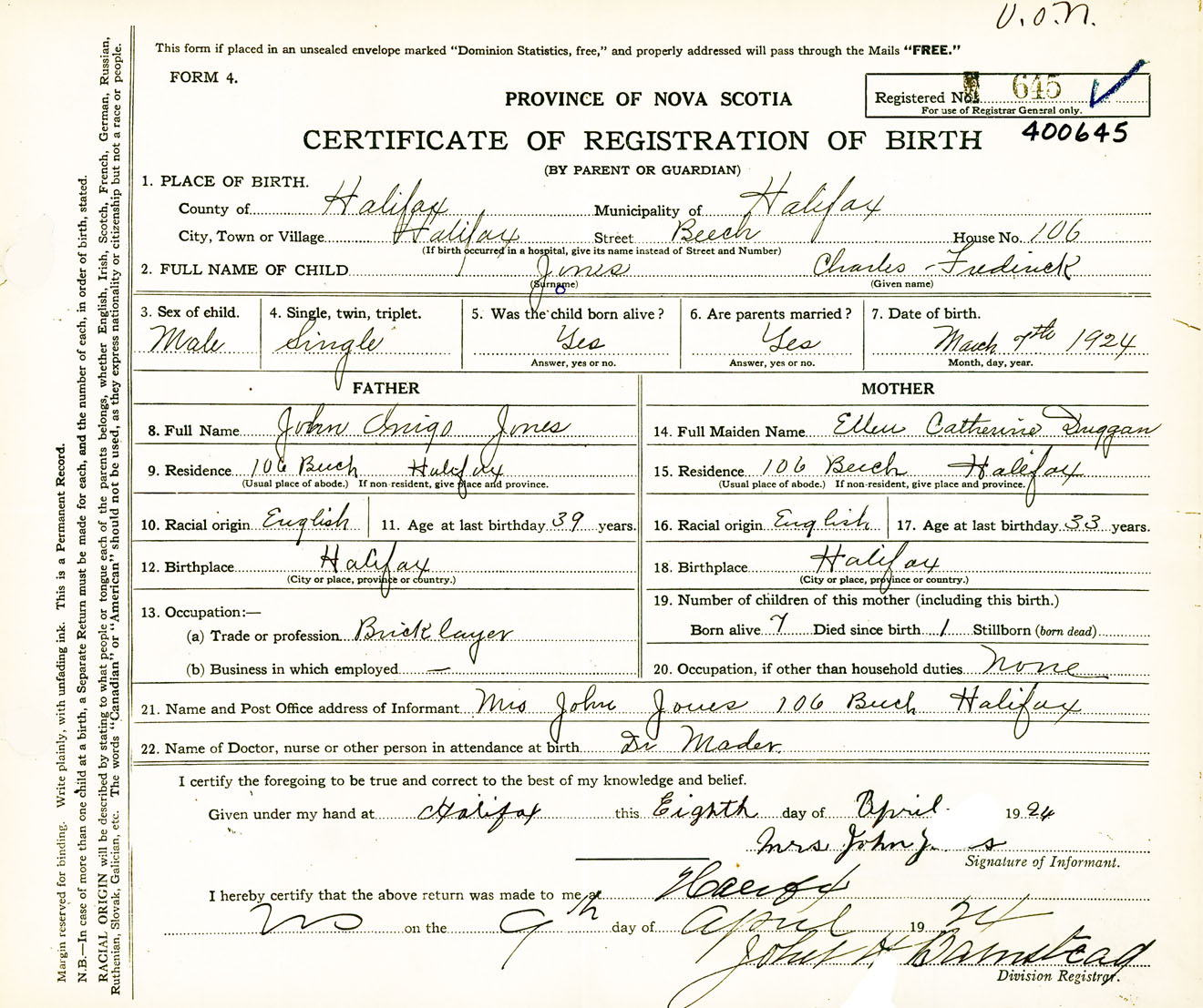 Male Birth Registration: Year: 1924 number: 40000645
