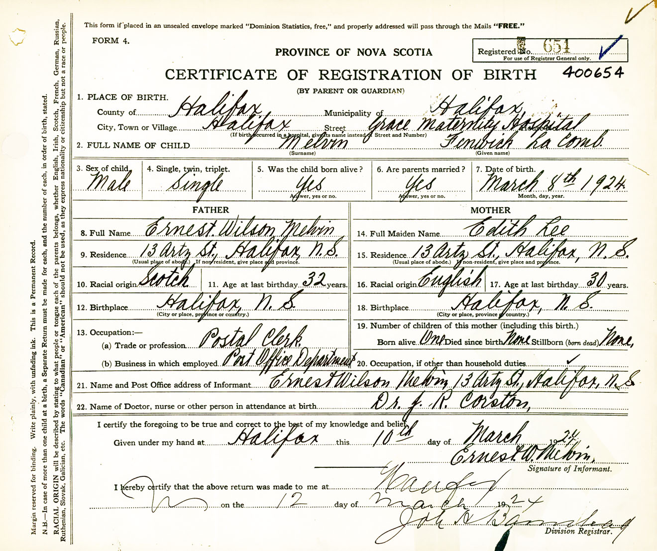Male Birth Registration: Year: 1924 number: 40000654