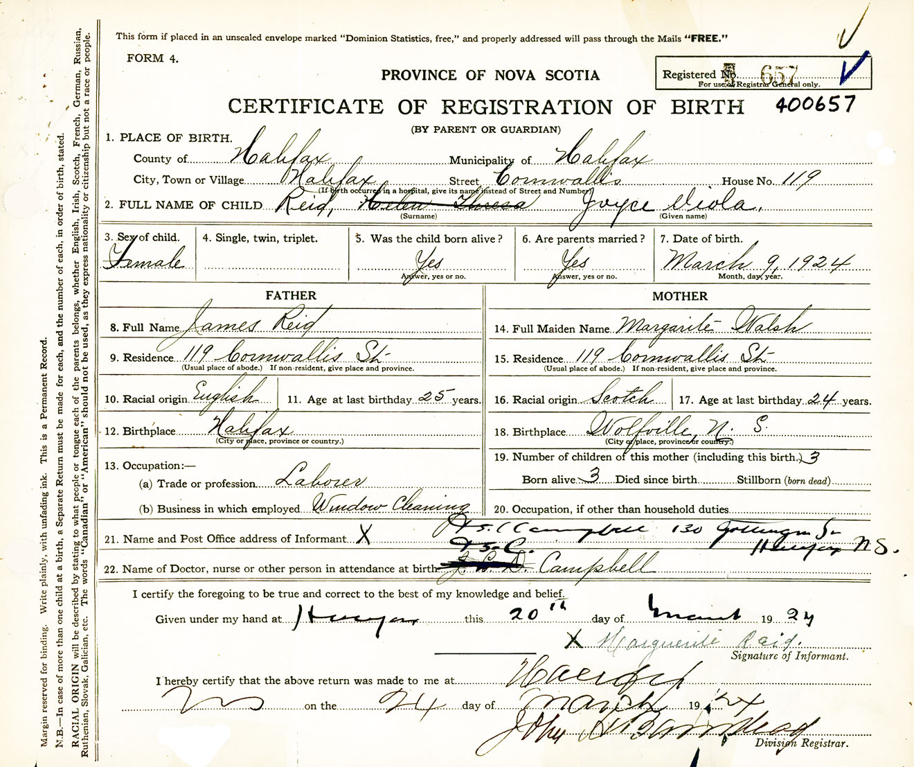 Female Birth Registration: Year: 1924 number: 40000657