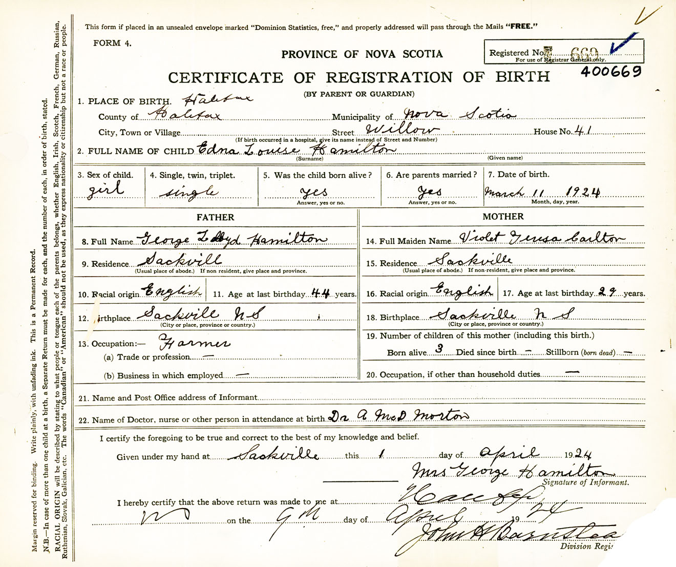 Female Birth Registration: Year: 1924 number: 40000669