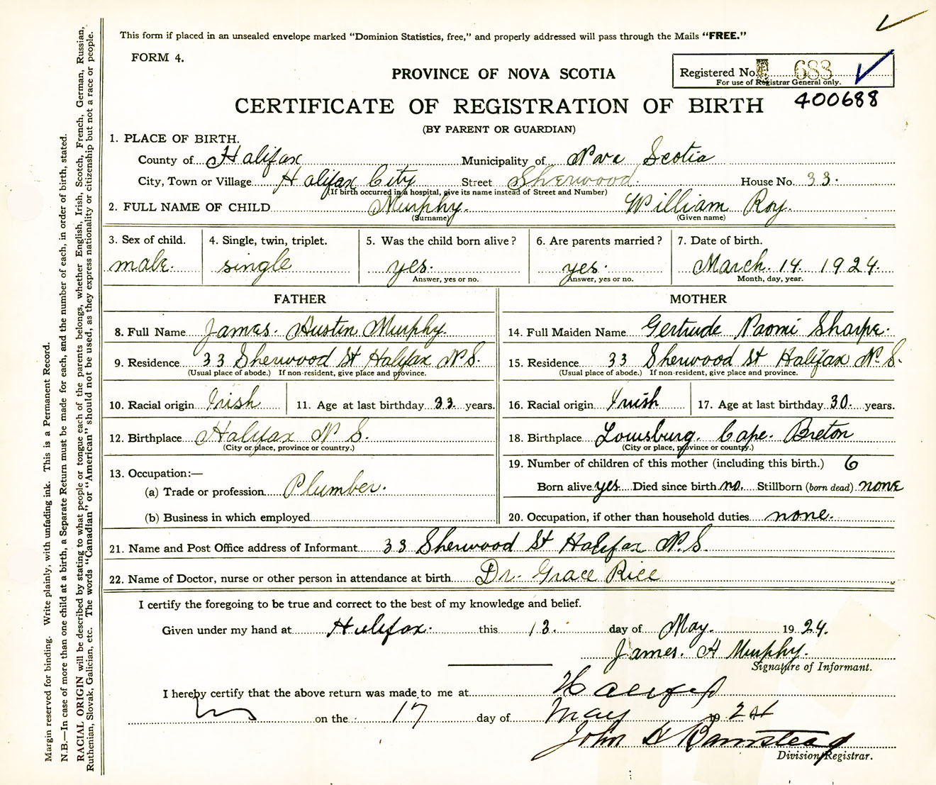 Male Birth Registration: Year: 1924 number: 40000688