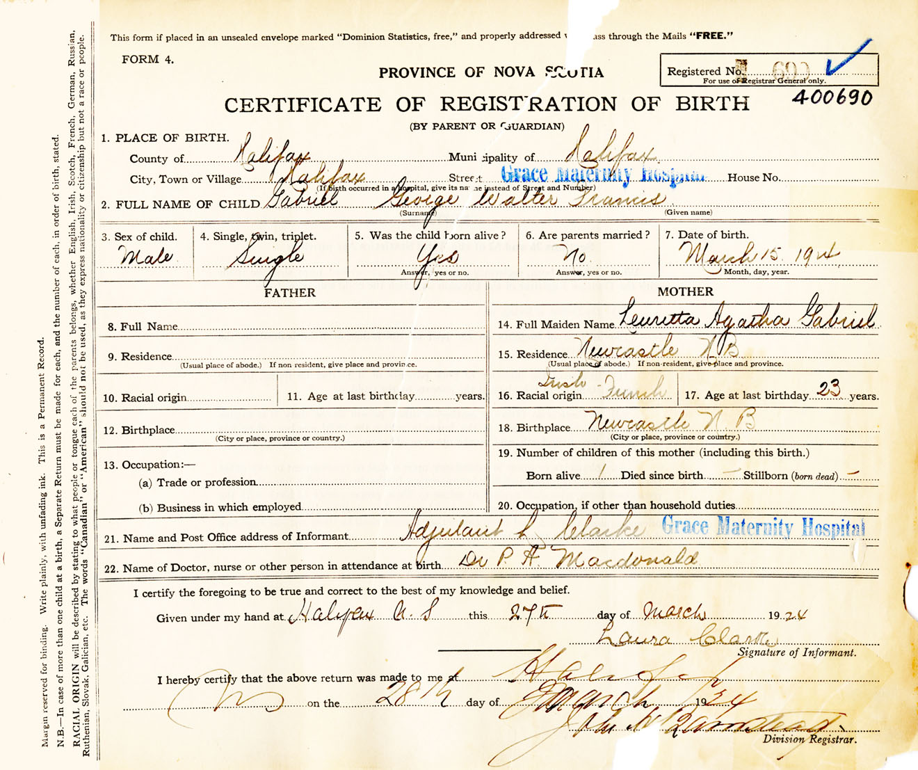 Male Birth Registration: Year: 1924 number: 40000690