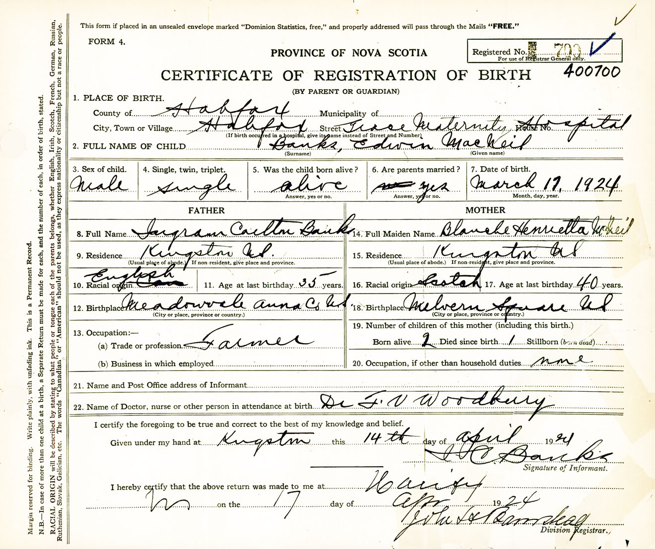 Male Birth Registration: Year: 1924 number: 40000700