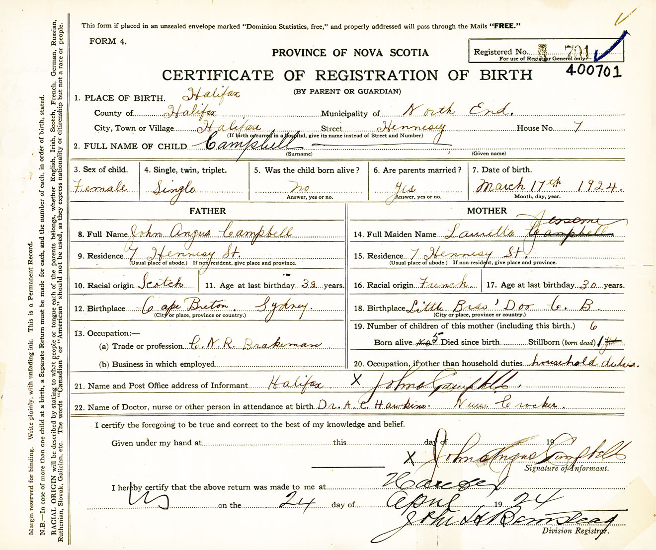 Female Birth Registration: Year: 1924 number: 40000701
