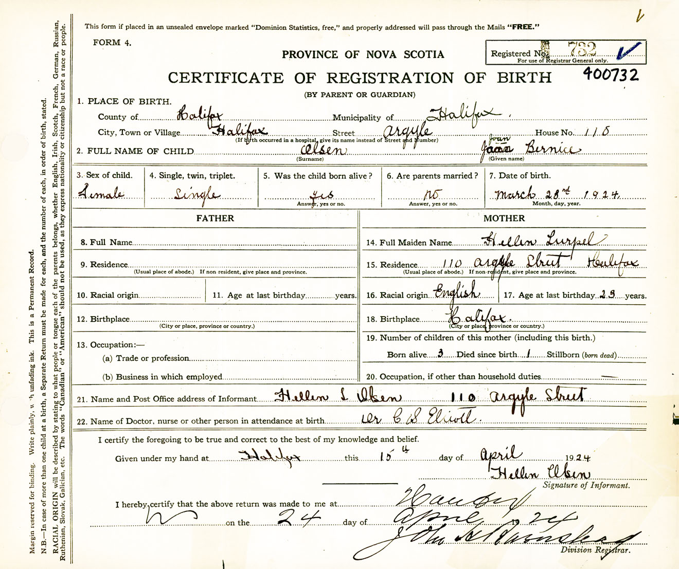 Female Birth Registration: Year: 1924 number: 40000732