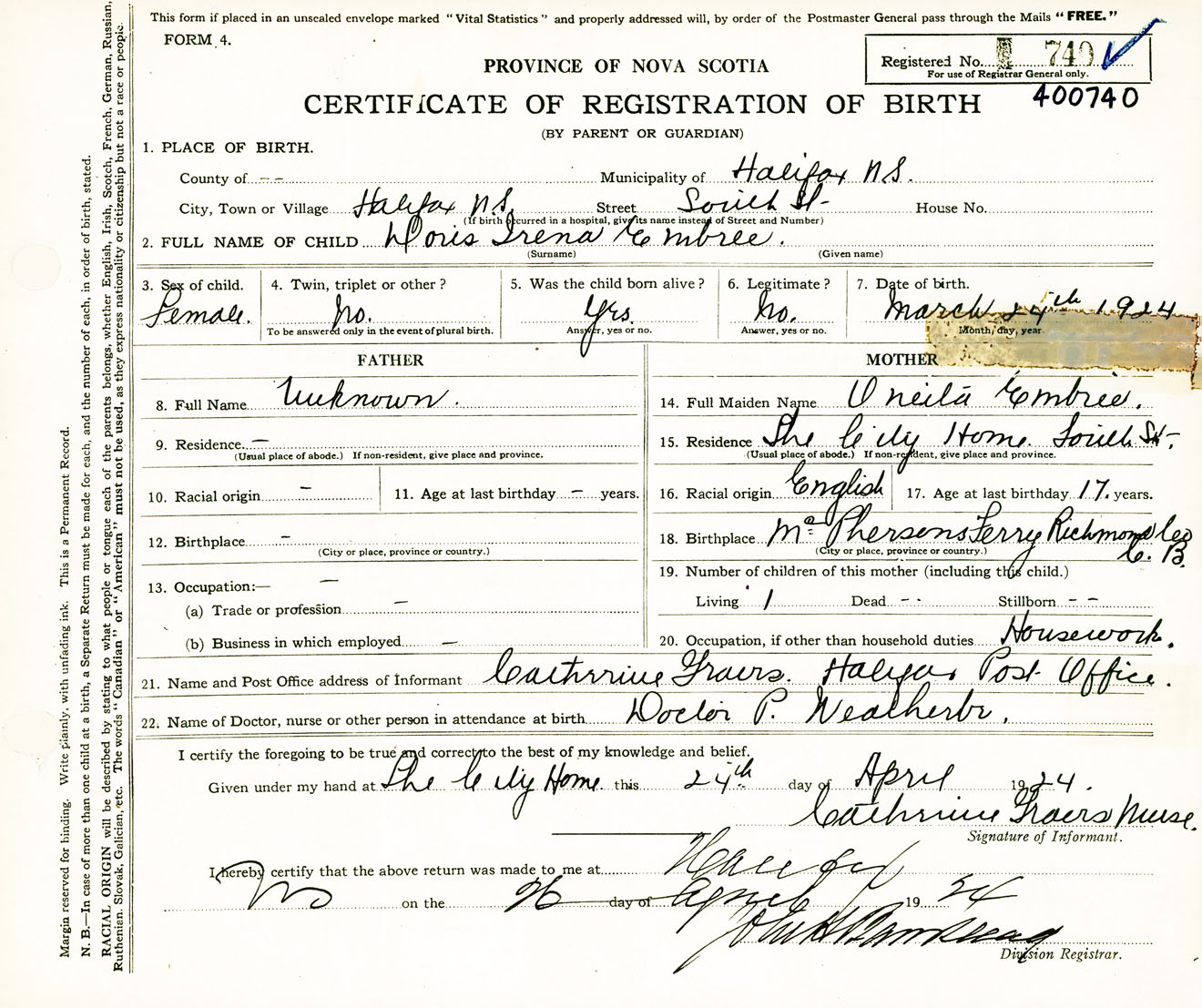 Female Birth Registration: Year: 1924 number: 40000740