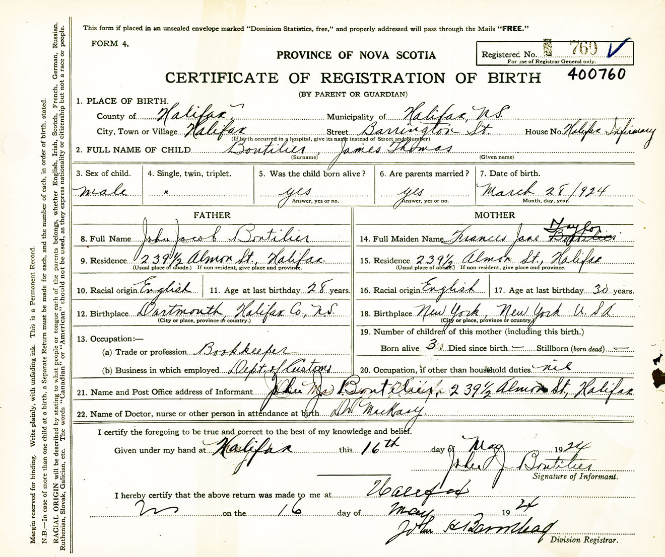 Male Birth Registration: Year: 1924 number: 40000760