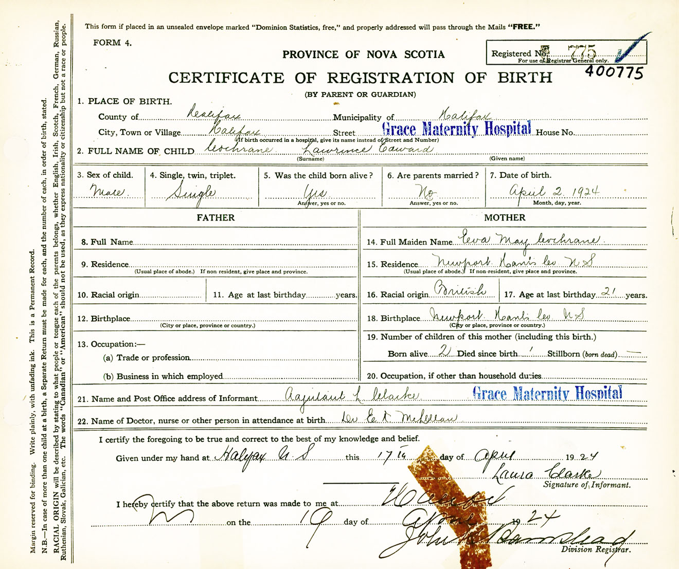 Male Birth Registration: Year: 1924 number: 40000775