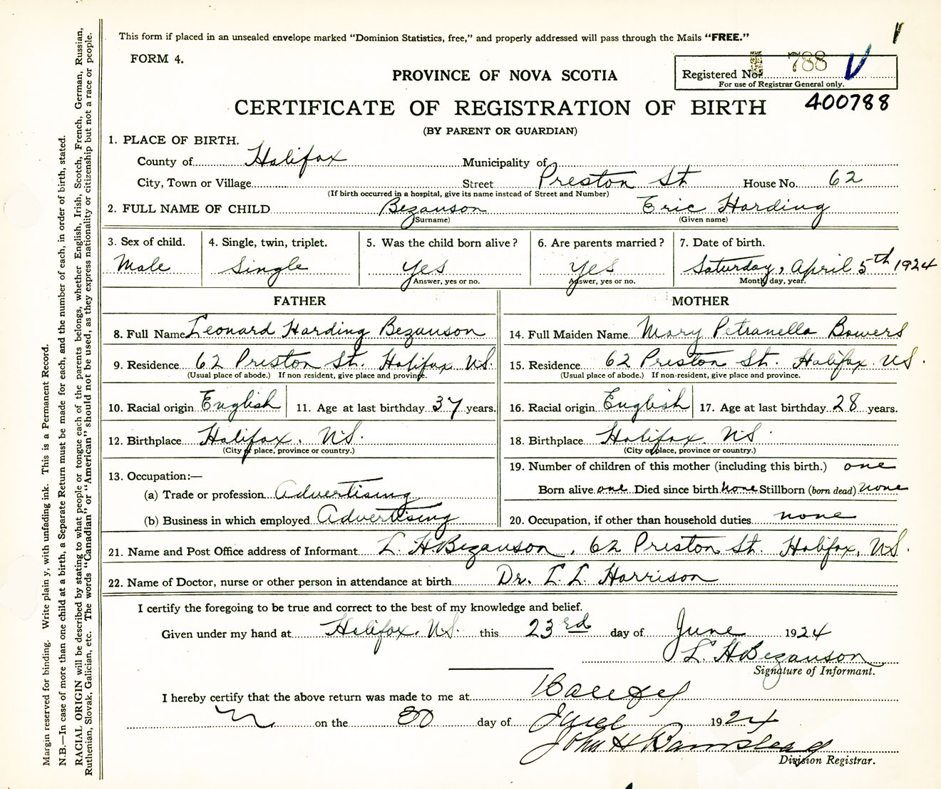 Male Birth Registration: Year: 1924 number: 40000788