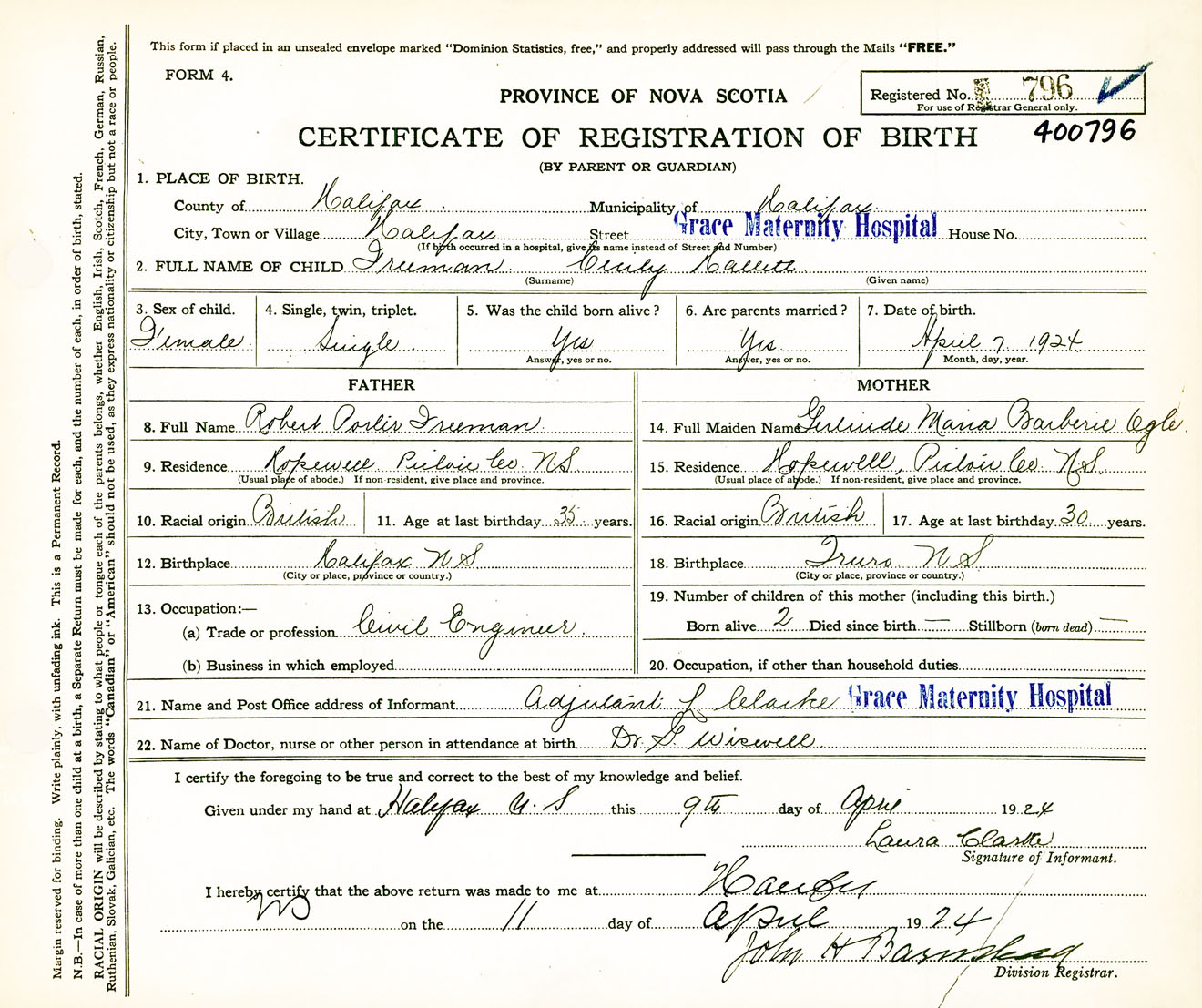 Female Birth Registration: Year: 1924 number: 40000796