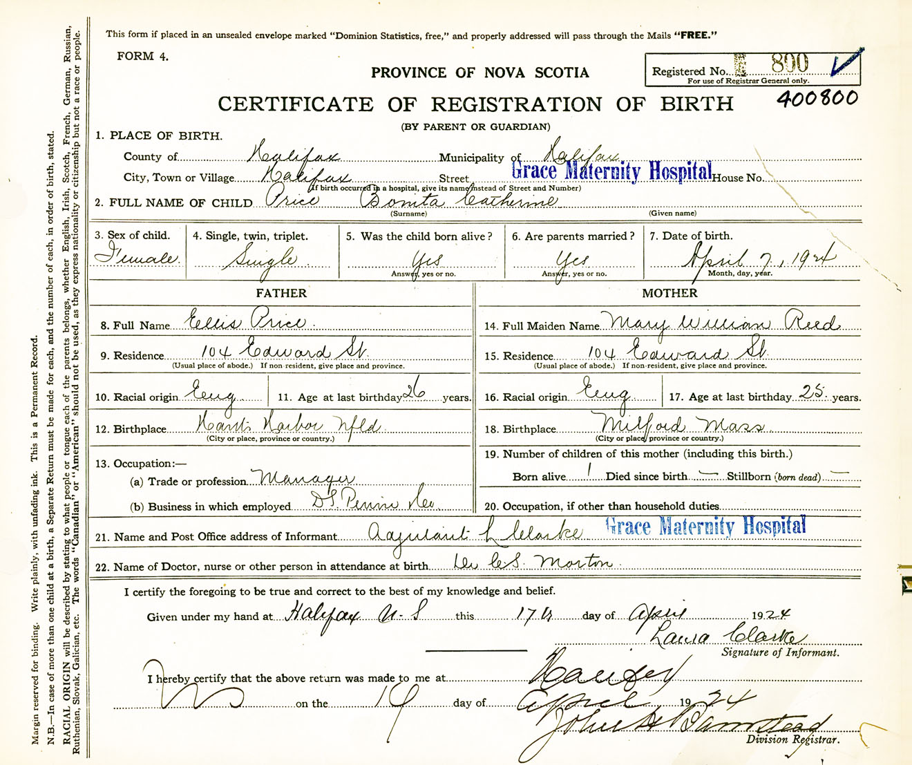 Female Birth Registration: Year: 1924 number: 40000800