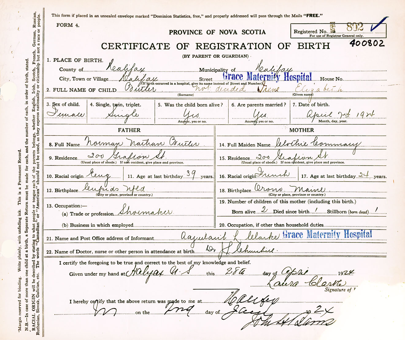 Female Birth Registration: Year: 1924 number: 40000802