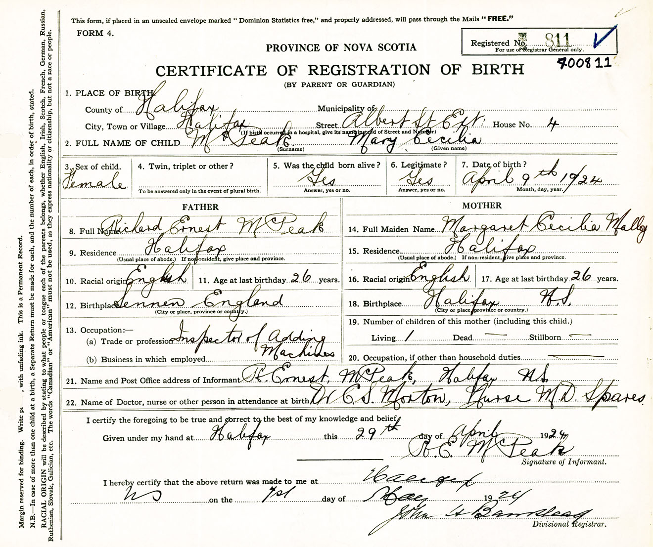 Female Birth Registration: Year: 1924 number: 40000811