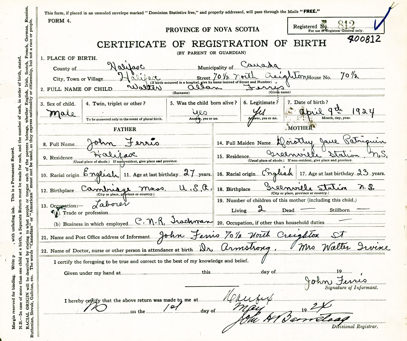 Male Birth Registration: Year: 1924 number: 40000812