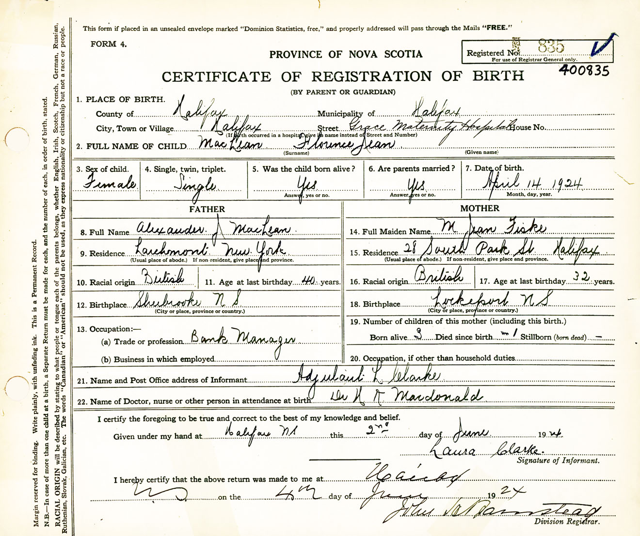 Female Birth Registration: Year: 1924 number: 40000835