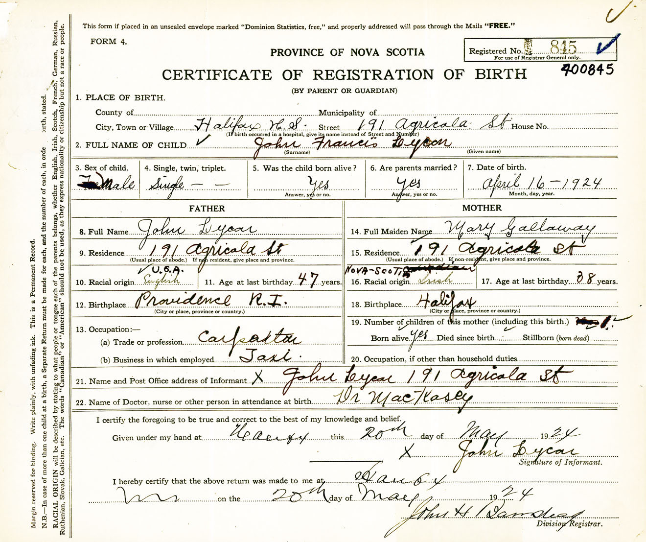 Male Birth Registration: Year: 1924 number: 40000845