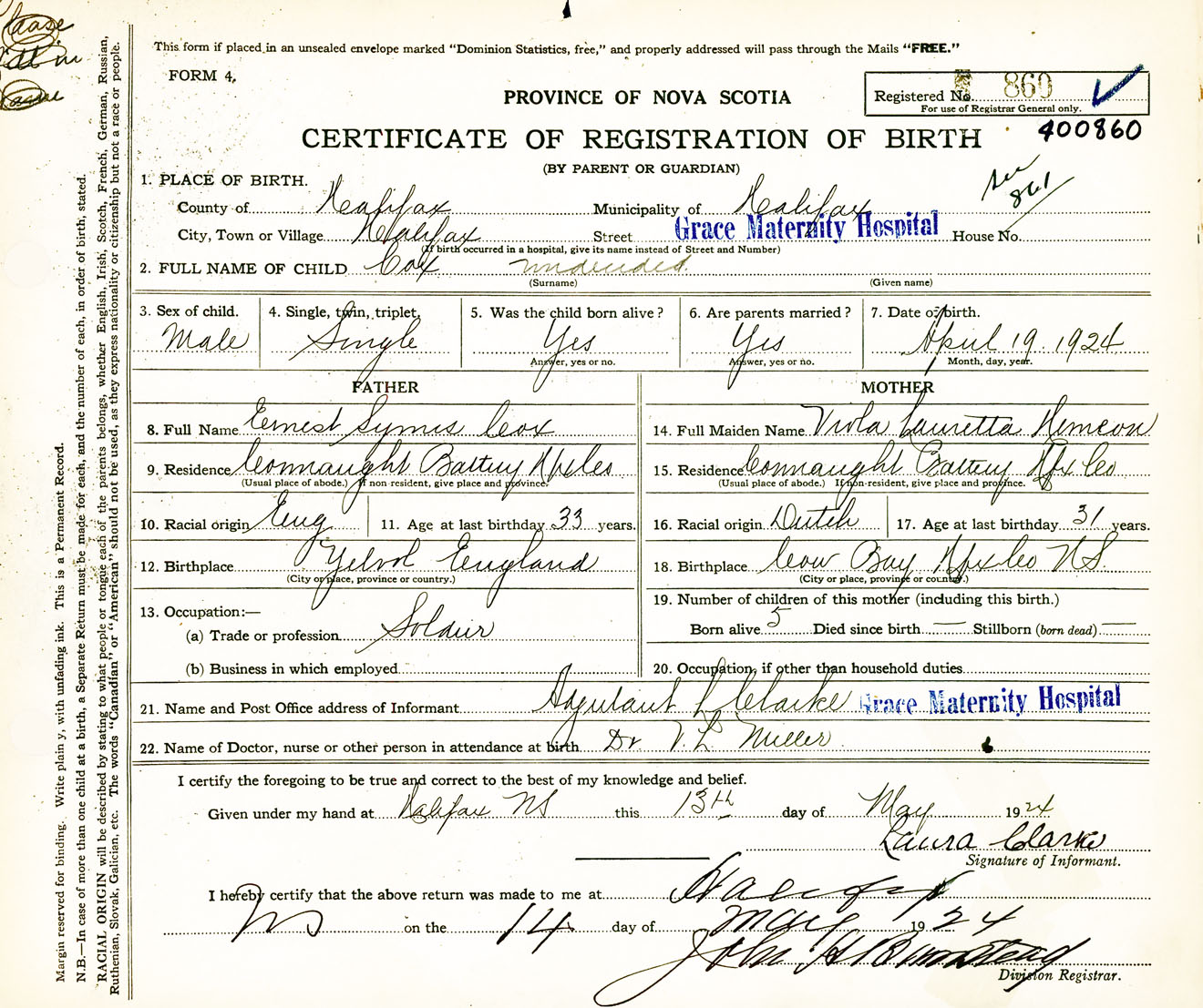 Male Birth Registration: Year: 1924 number: 40000860