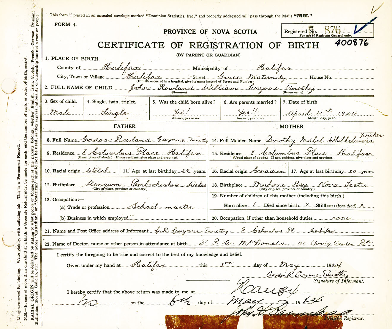 Male Birth Registration: Year: 1924 number: 40000876