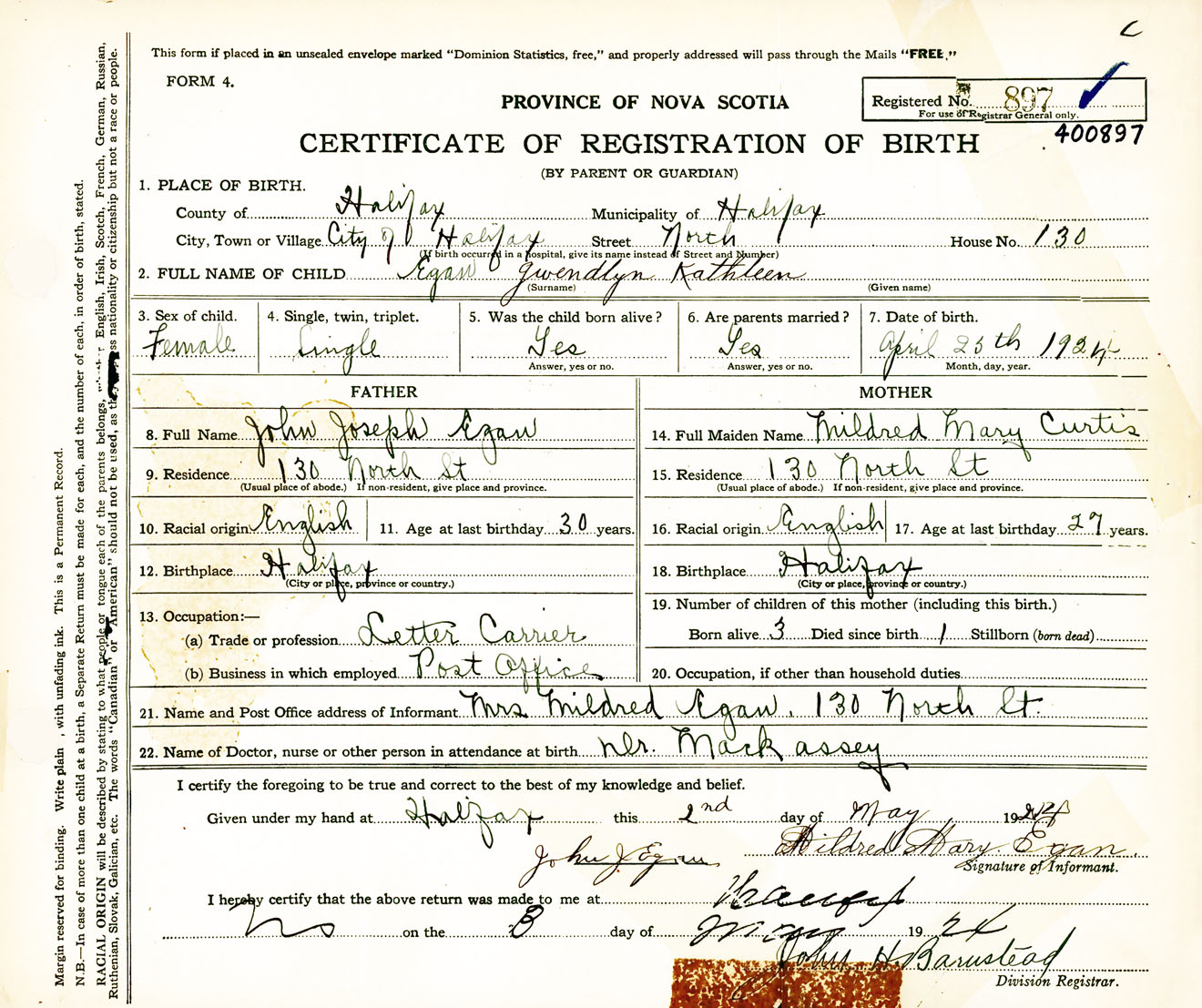 Female Birth Registration: Year: 1924 number: 40000897