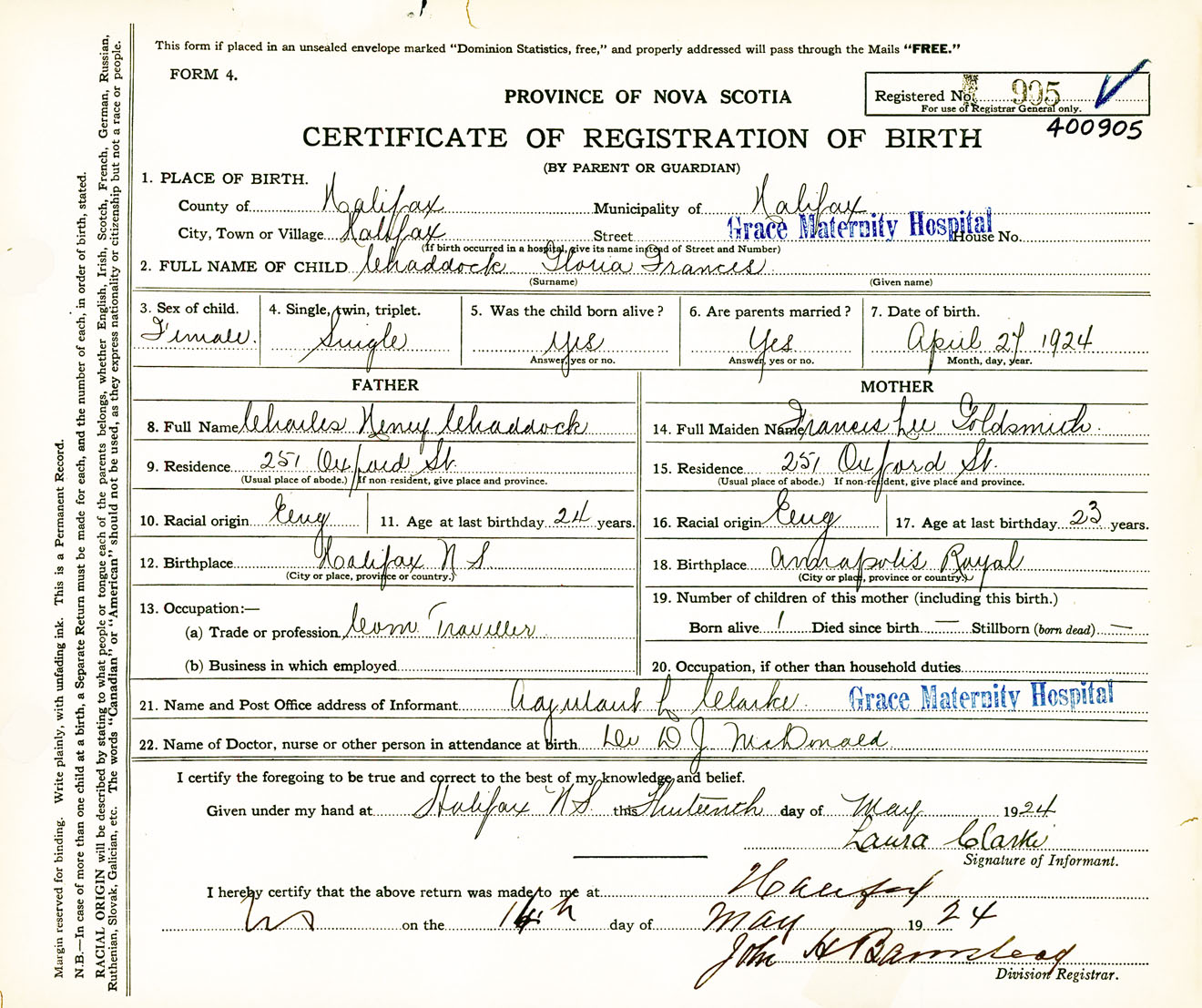 Female Birth Registration: Year: 1924 number: 40000905