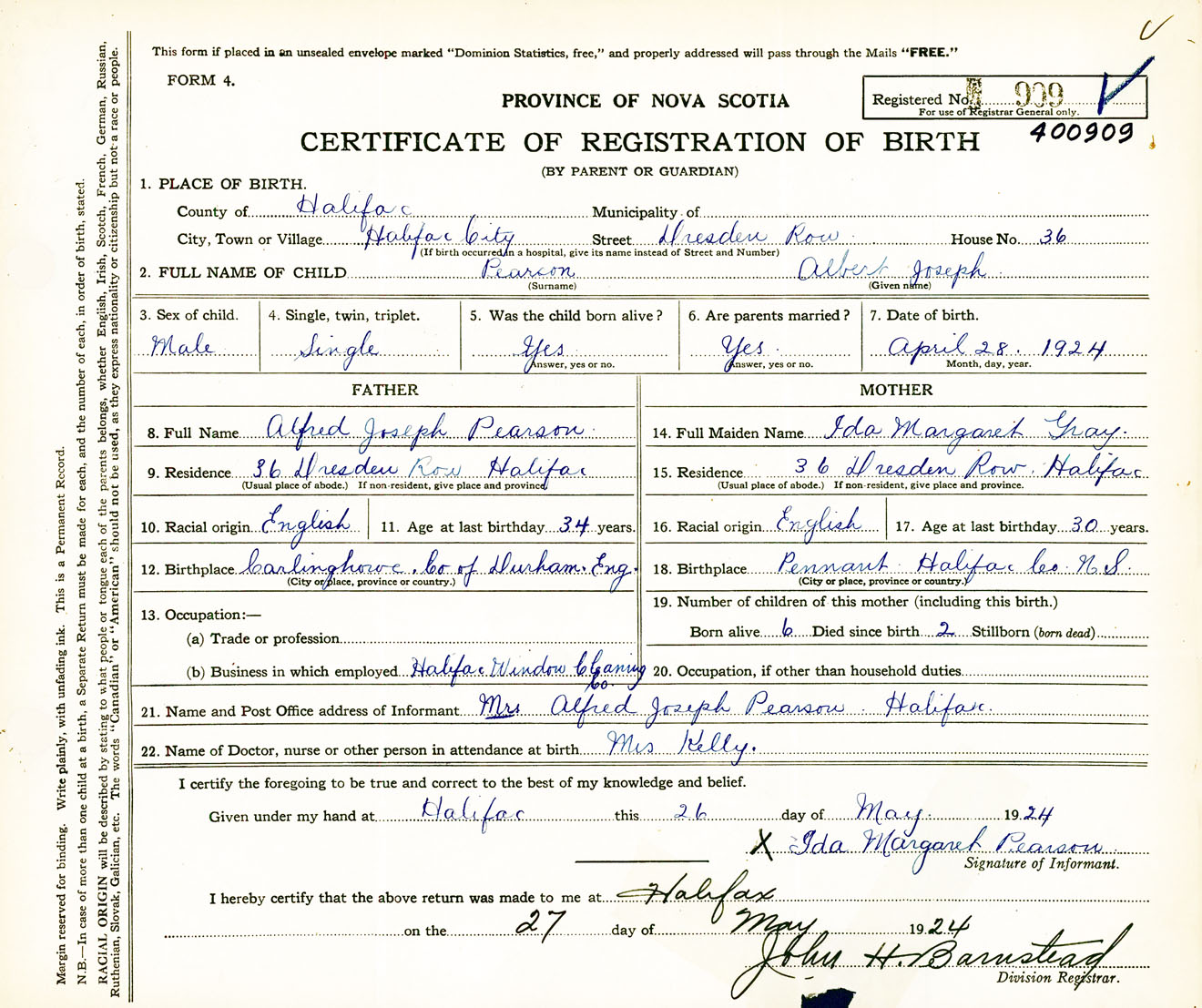 Male Birth Registration: Year: 1924 number: 40000909