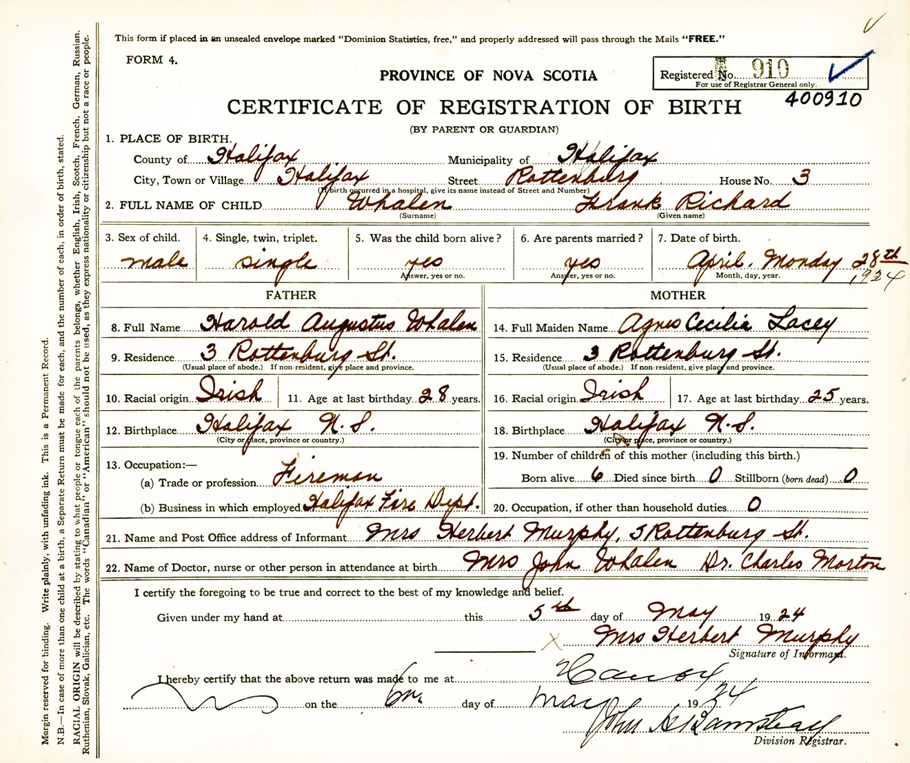 Male Birth Registration: Year: 1924 number: 40000910