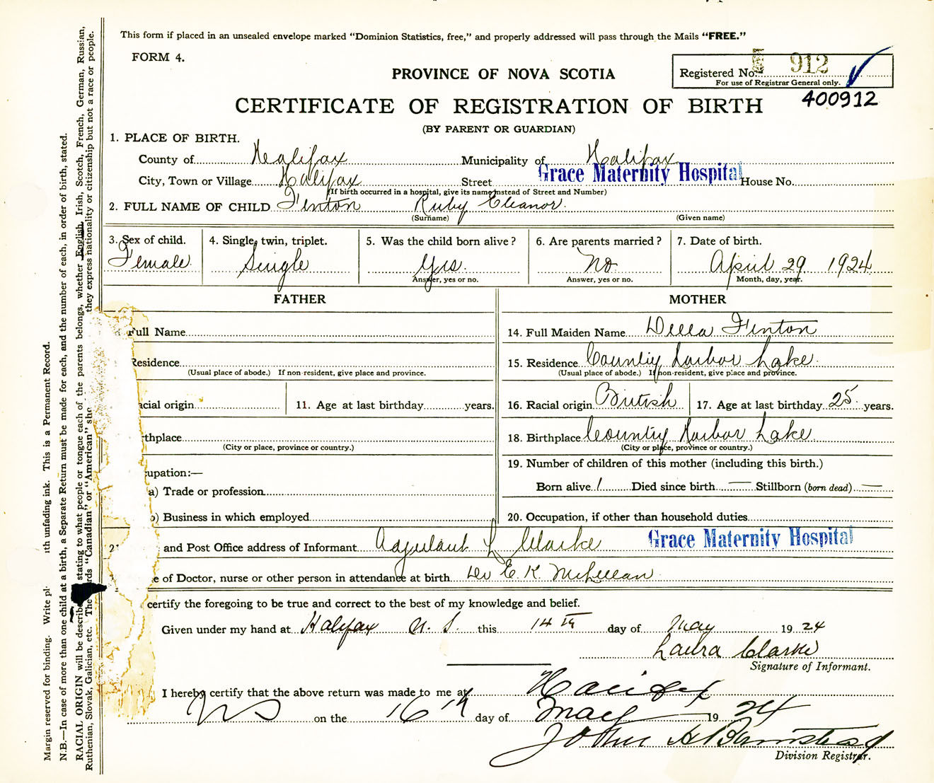 Female Birth Registration: Year: 1924 number: 40000912