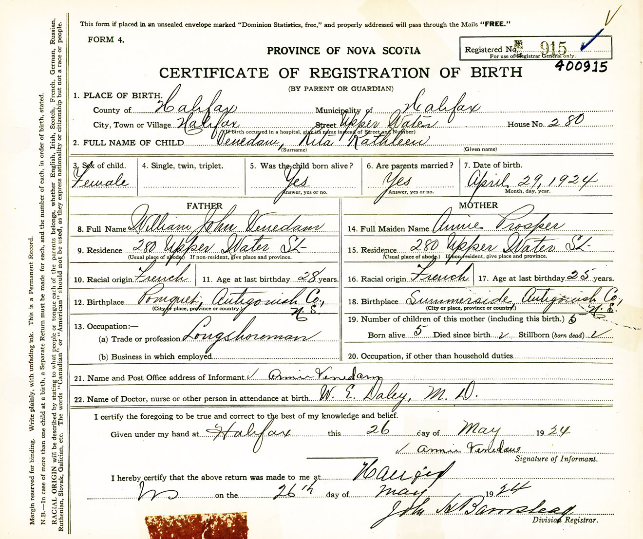 Female Birth Registration: Year: 1924 number: 40000915