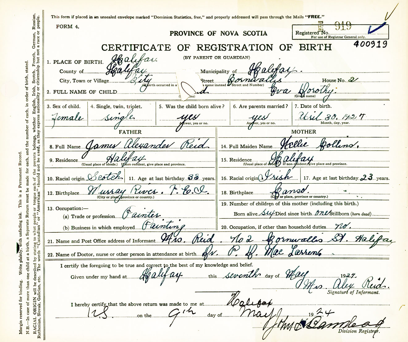 Female Birth Registration: Year: 1924 number: 40000919