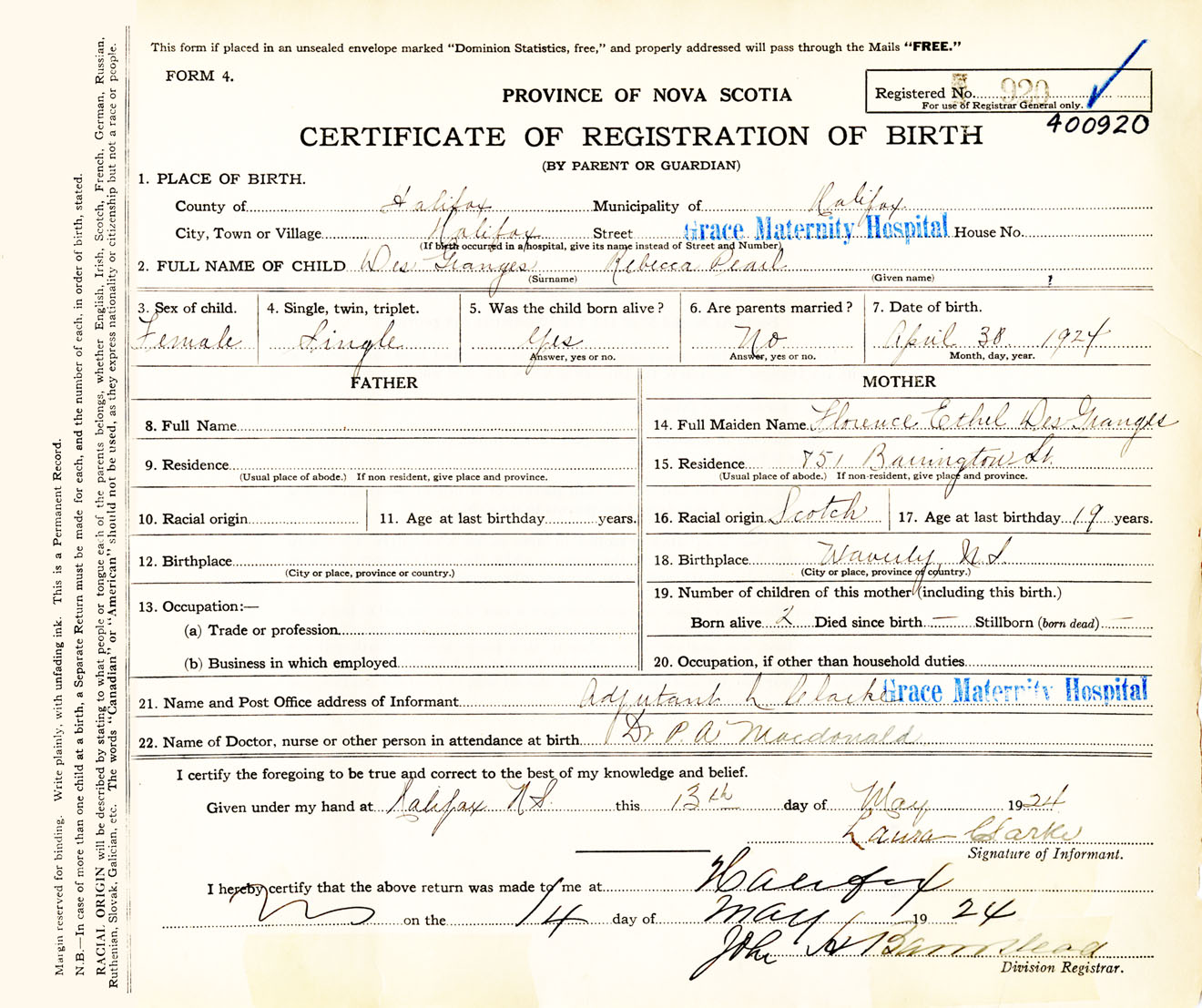 Female Birth Registration: Year: 1924 number: 40000920