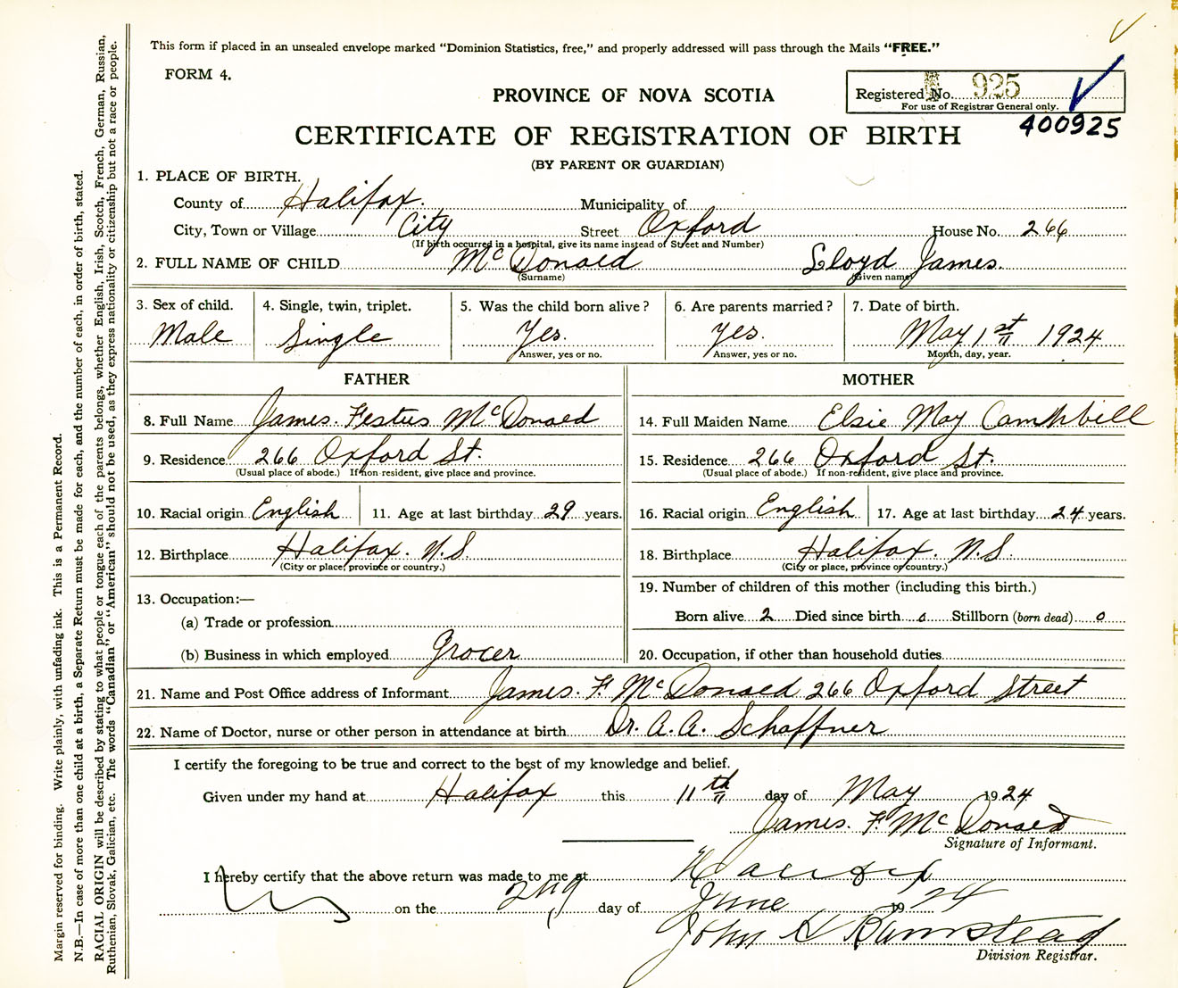Male Birth Registration: Year: 1924 number: 40000925