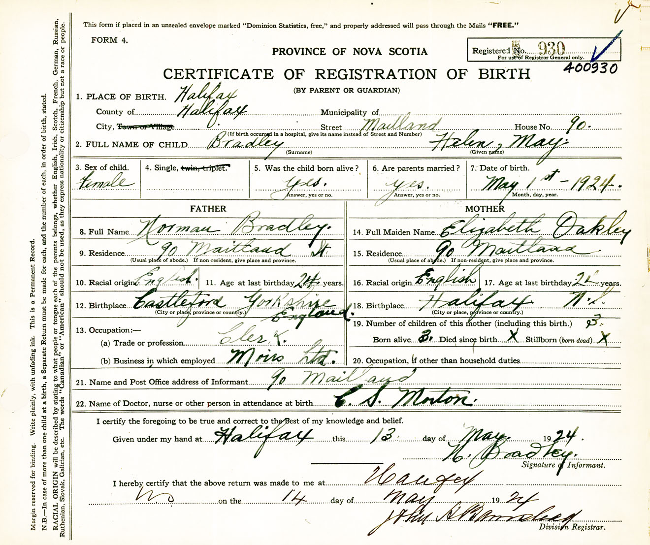 Female Birth Registration: Year: 1924 number: 40000930
