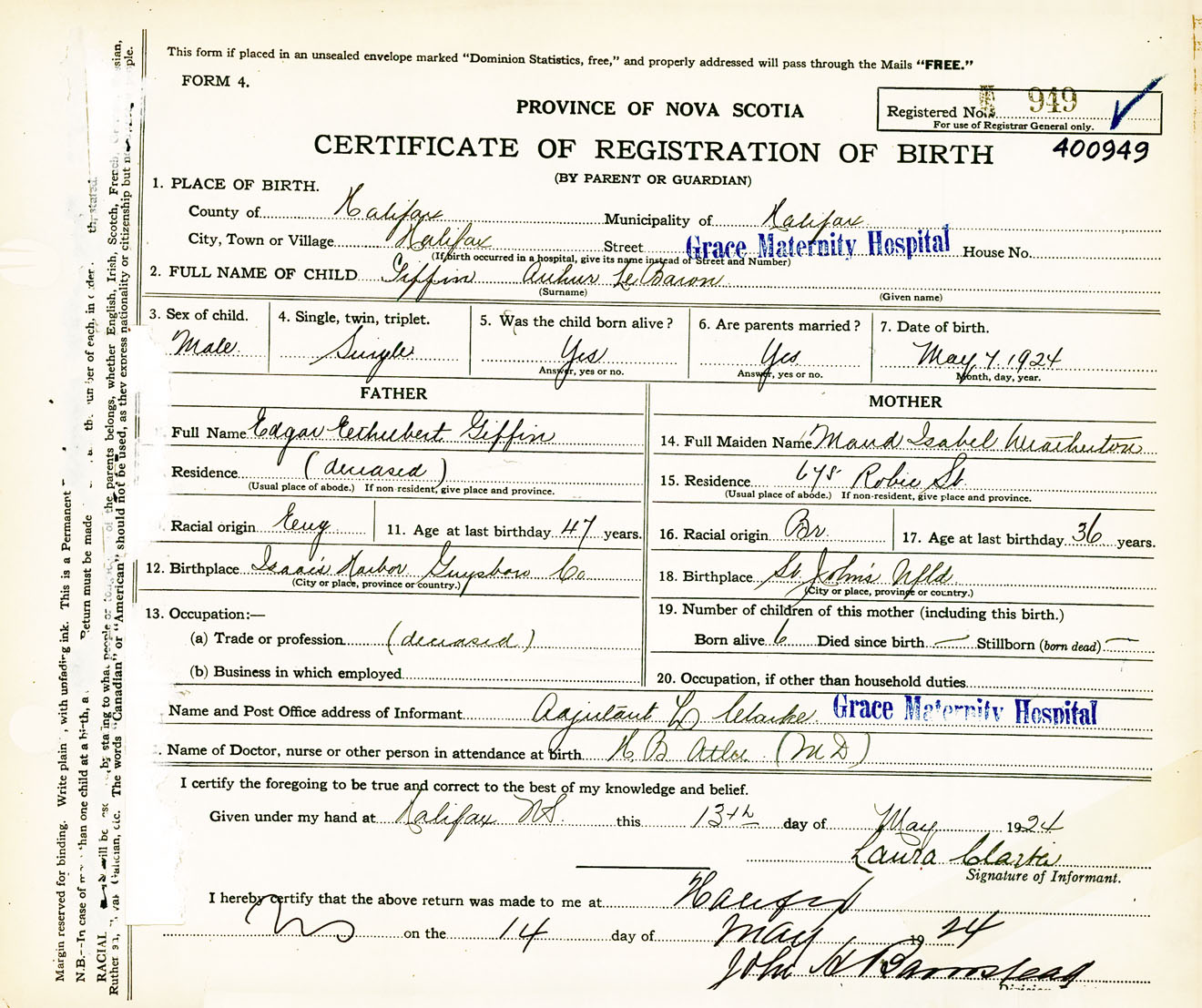 Male Birth Registration: Year: 1924 number: 40000949