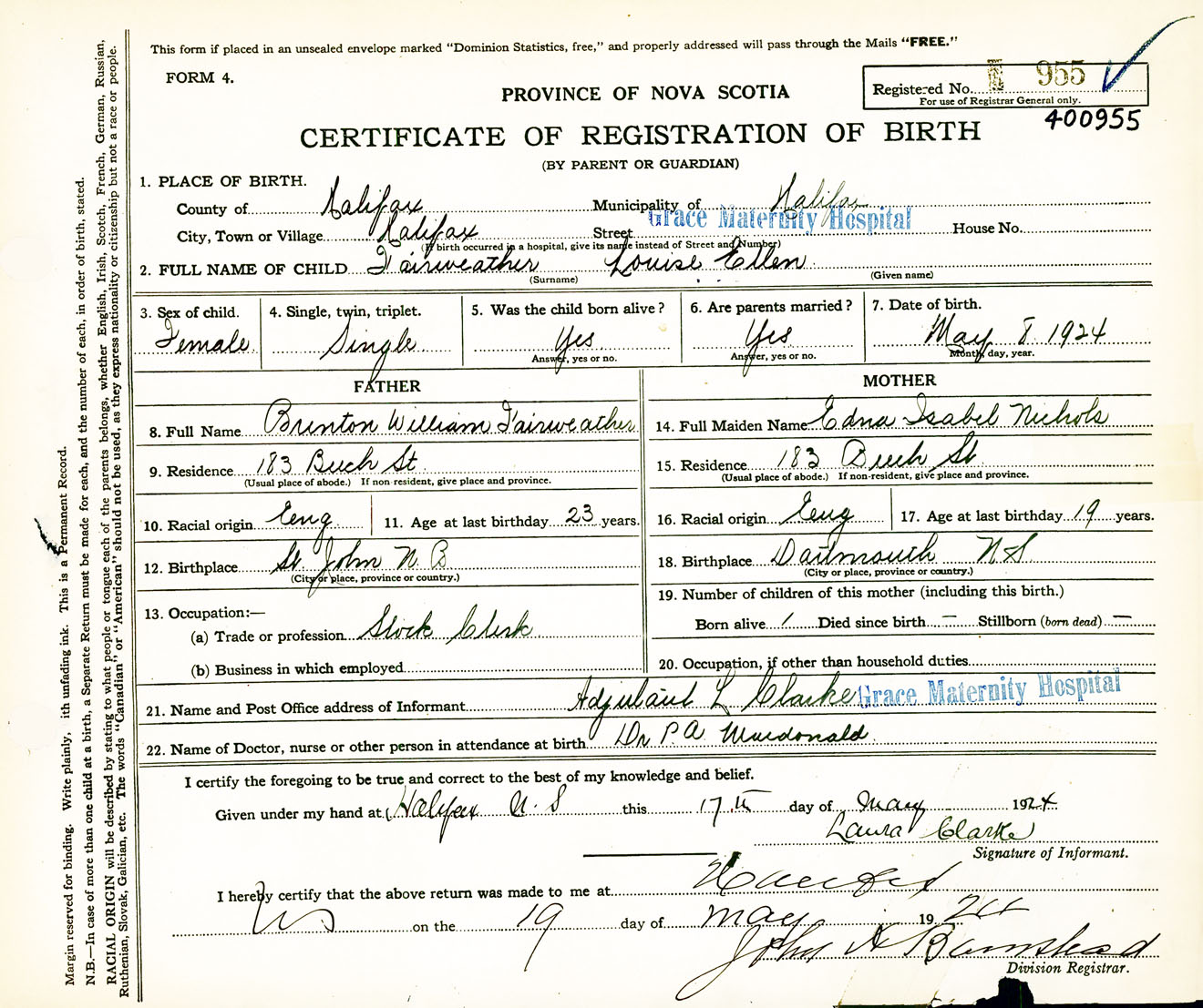 Female Birth Registration: Year: 1924 number: 40000955