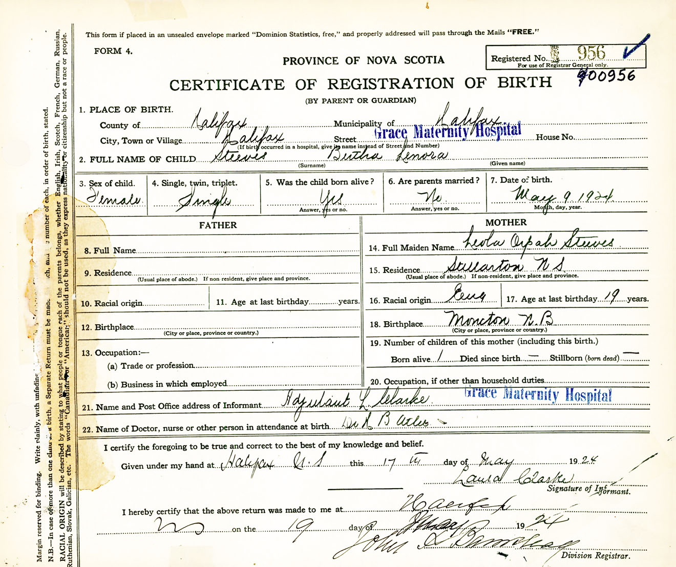 Female Birth Registration: Year: 1924 number: 40000956