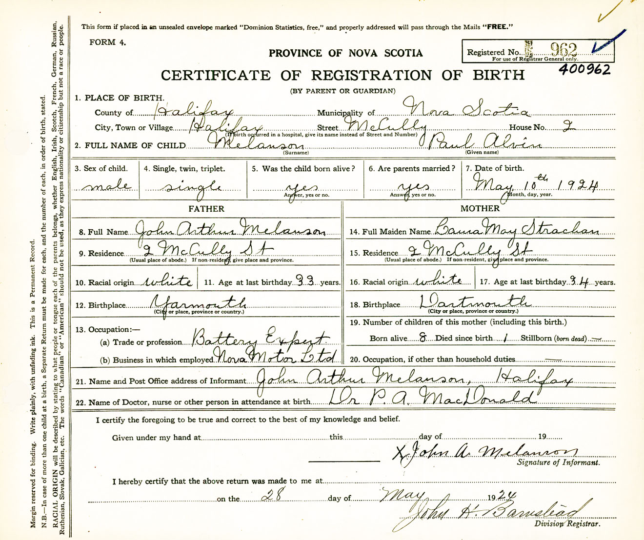 Male Birth Registration: Year: 1924 number: 40000962