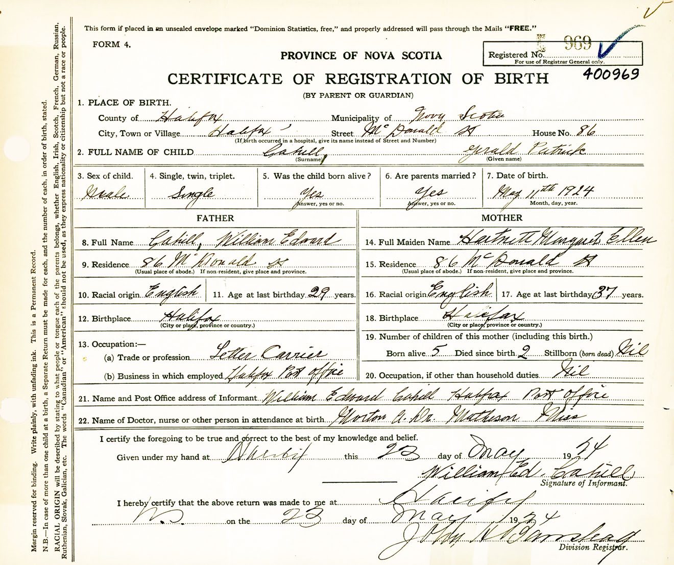 Male Birth Registration: Year: 1924 number: 40000969