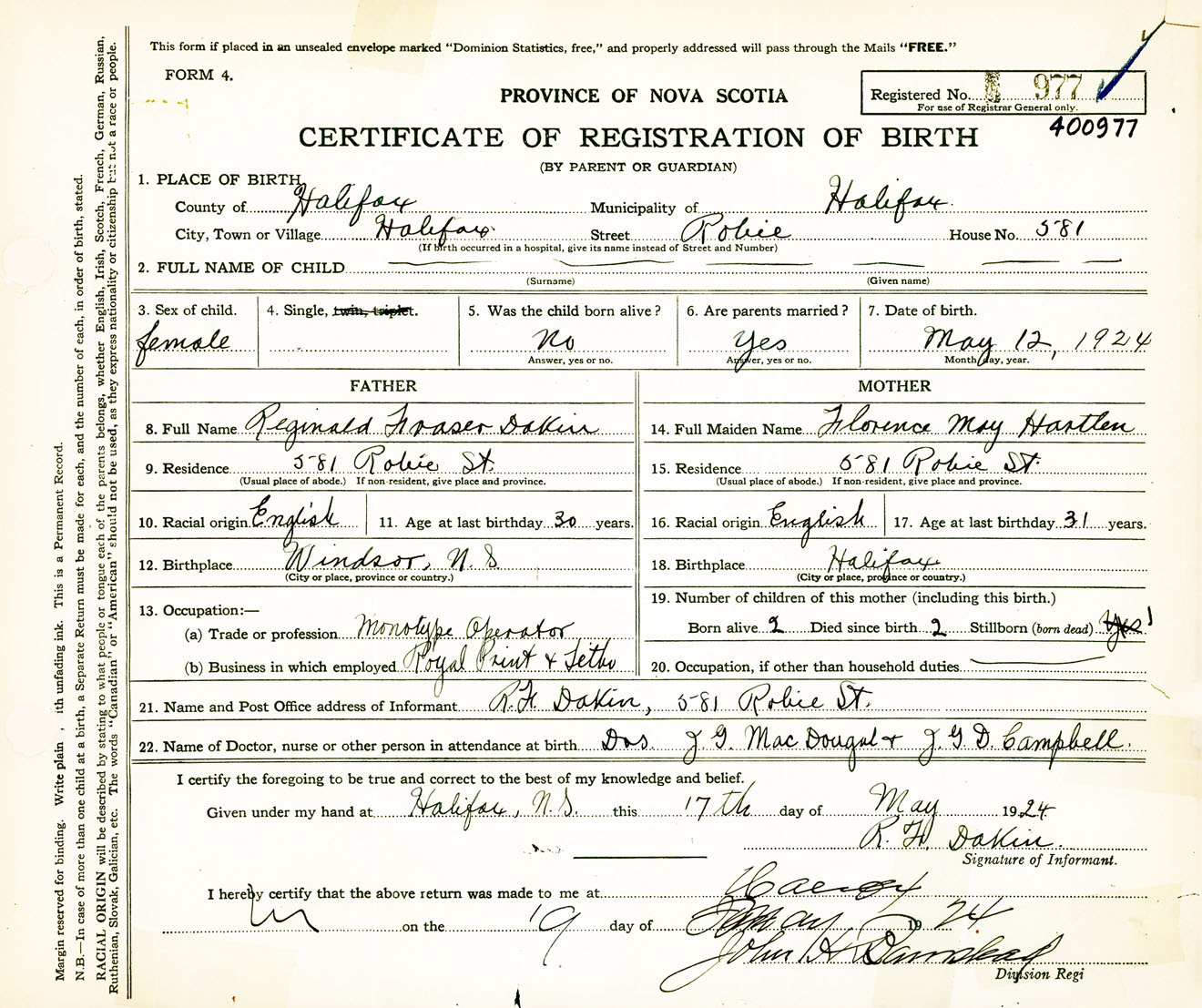 Female Birth Registration: Year: 1924 number: 40000977