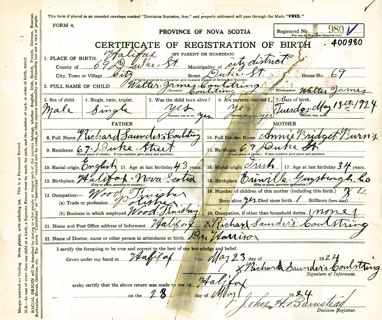 Male Birth Registration: Year: 1924 number: 40000980