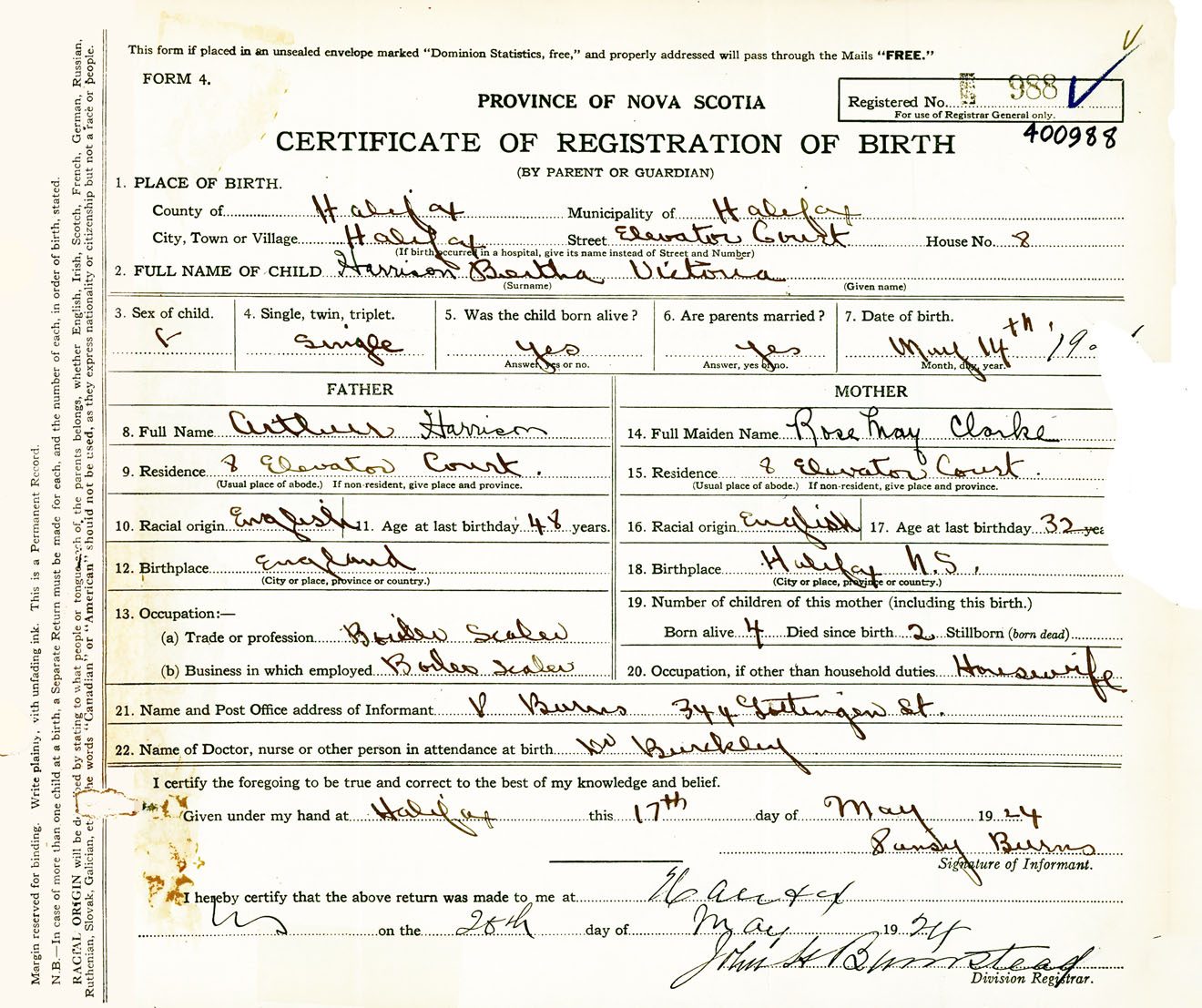 Female Birth Registration: Year: 1924 number: 40000988