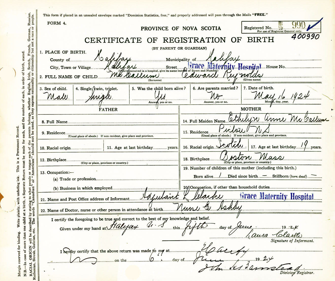 Male Birth Registration: Year: 1924 number: 40000990