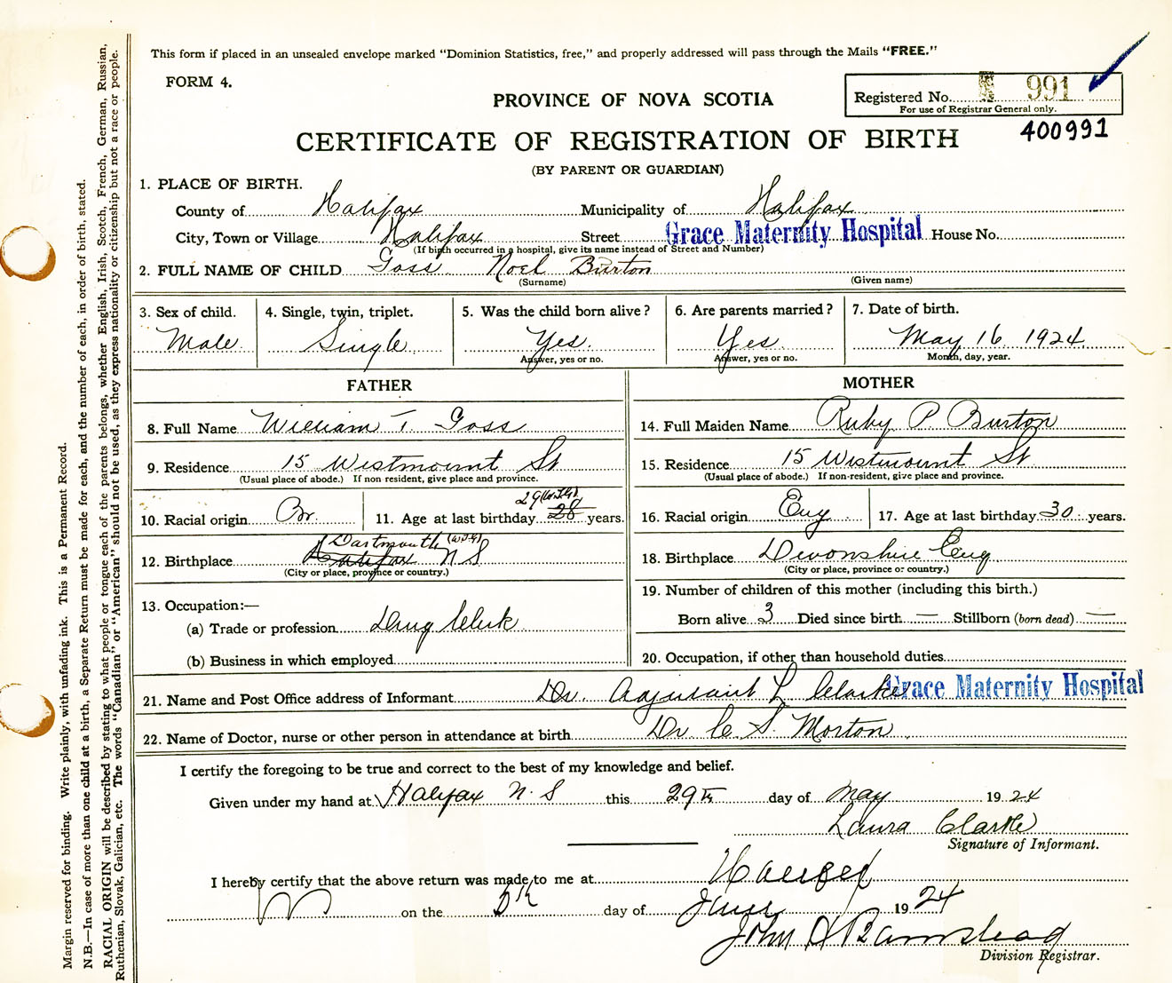 Male Birth Registration: Year: 1924 number: 40000991